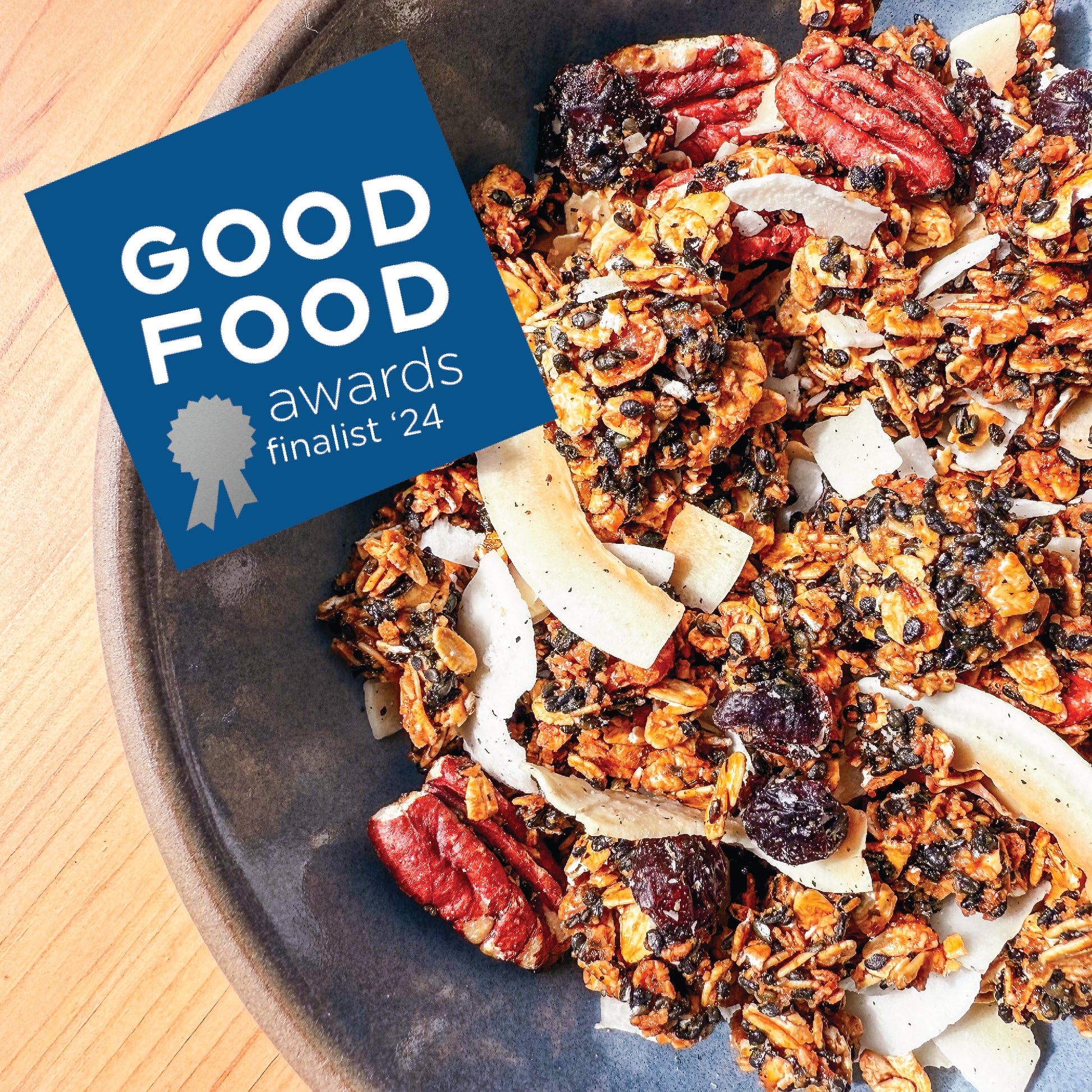 Ingredients: Rolled Oats,* Coconut Chips,* Black Sesame Seeds,* Pecans,* Dried Cranberries (Cranberries, Apple Juice),* Blue Agave Syrup,* Clover Honey,* Brown Sugar,* Tahini,* Blackstrap Molasses,* Salt.